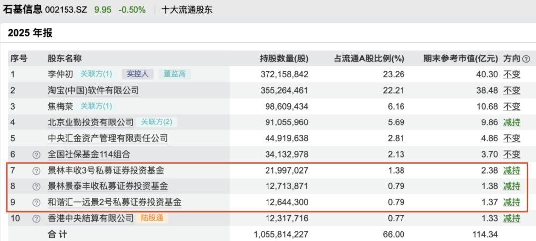 由蒋彤管理的景林丰收3号减持石基信息44.19万股,期末持股数量为2199.7万股;景林景泰丰收私募证券投资基金四季度减持石基信息28.22万股,期末持股数量为1271.39万股。