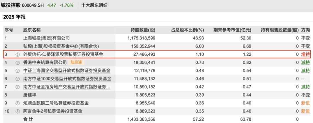 截至2025年底,夏俊杰管理的仁桥泽源股票私募证券投资基金成为城投控股第三大股东,持股数为2748.65万股,较第三季度末增持61.99万股。城投控股为夏俊杰的“心水股”,其管理的私募产品自2025年第一季度进入城投控股的十大股东名单,随后不断增持。