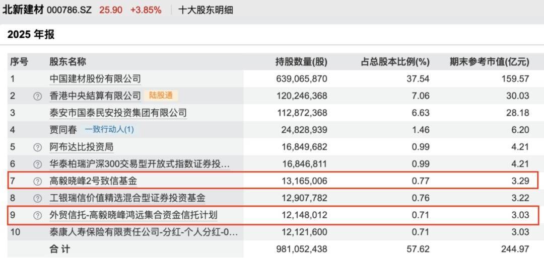 2025年三季报显示,高毅晓峰2号致信基金及高毅晓峰鸿远集合资金信托计划新进成为北新建材的前十大股东,合计持股数量为2481.3万股。相较于2025年三季度末,邓晓峰管理的两只产品合计加仓北新建材50万股。