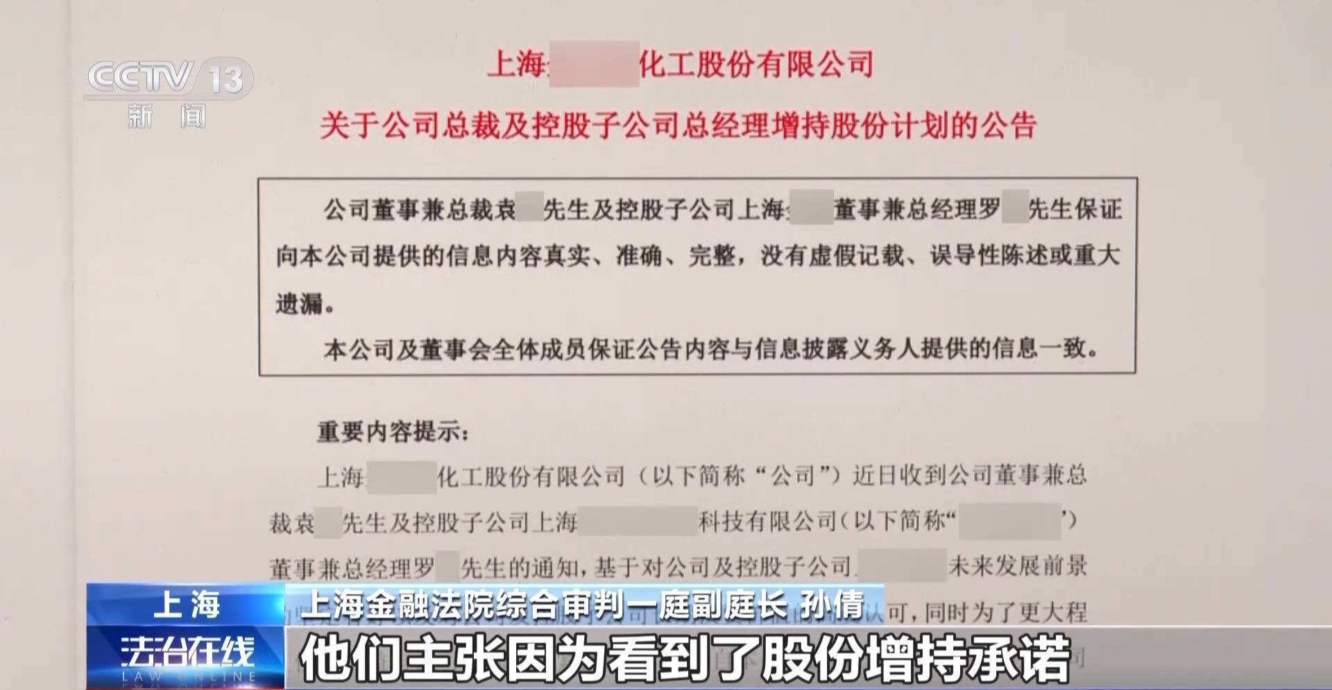上海金融法院综合审判一庭副庭长 孙倩:证监会对袁某、罗某采取出具警示函的行政监管措施,深圳证券交易所也对两人进行公开谴责,投资者纷纷诉到法院,他们主张因为看到了股份增持承诺购买了这家上市公司股票,而袁某、罗某未履行承诺,构成证券虚假陈述行为,所以要求上市公司和袁某、罗某共同赔偿投资差额损失、佣金损失等。