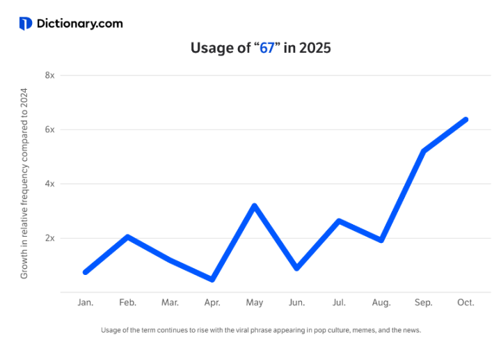 该网站的词典学家分析了大量数据,包括新闻标题、社交媒体趋势、搜索引擎结果等,以识别那些对线上和线下对话产生影响的词汇。结果发现,对“67”的搜索量从2025年夏天开始急剧上升。自6月以来,这些搜索量增加了六倍多,到目前为止,这种激增迹象并未停止。在这段时间内,其他大多数两位数数字都没有出现有意义的趋势,这表明“67”有某种特别之处,但又没有准确的解释。