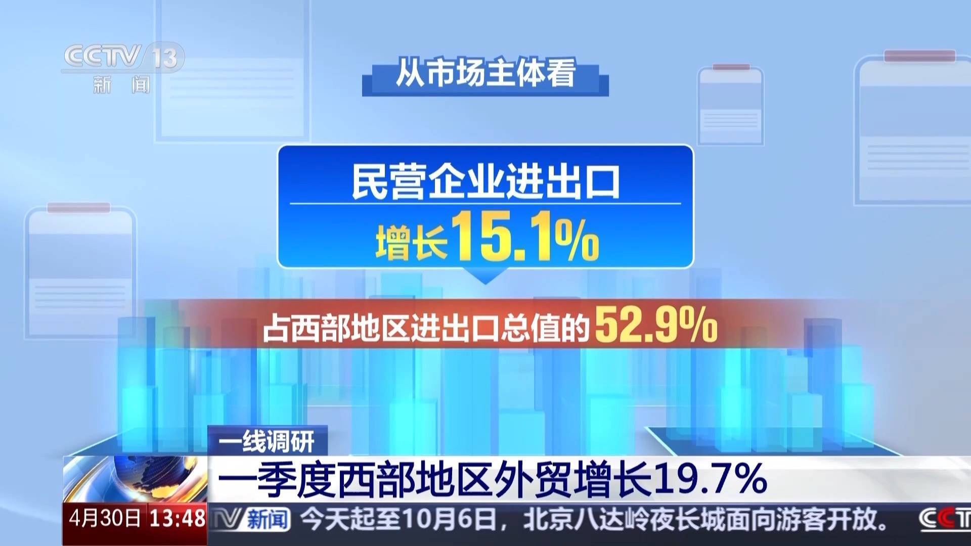 据海关最新统计显示,今年一季度,我国西部12省区市进出口规模首次超过1万亿元,创历史同期新高,占全国比重进一步提升至9.9%。